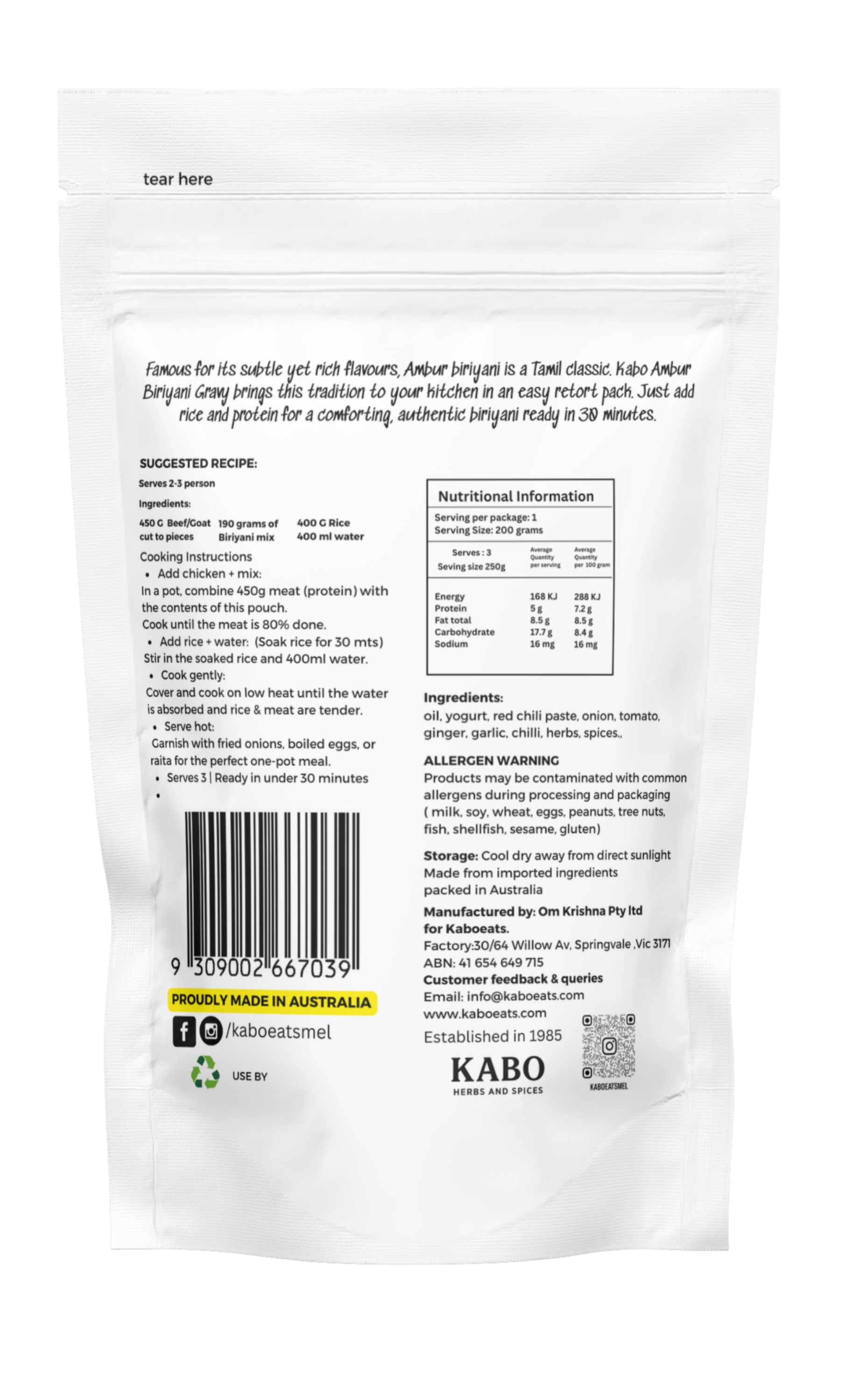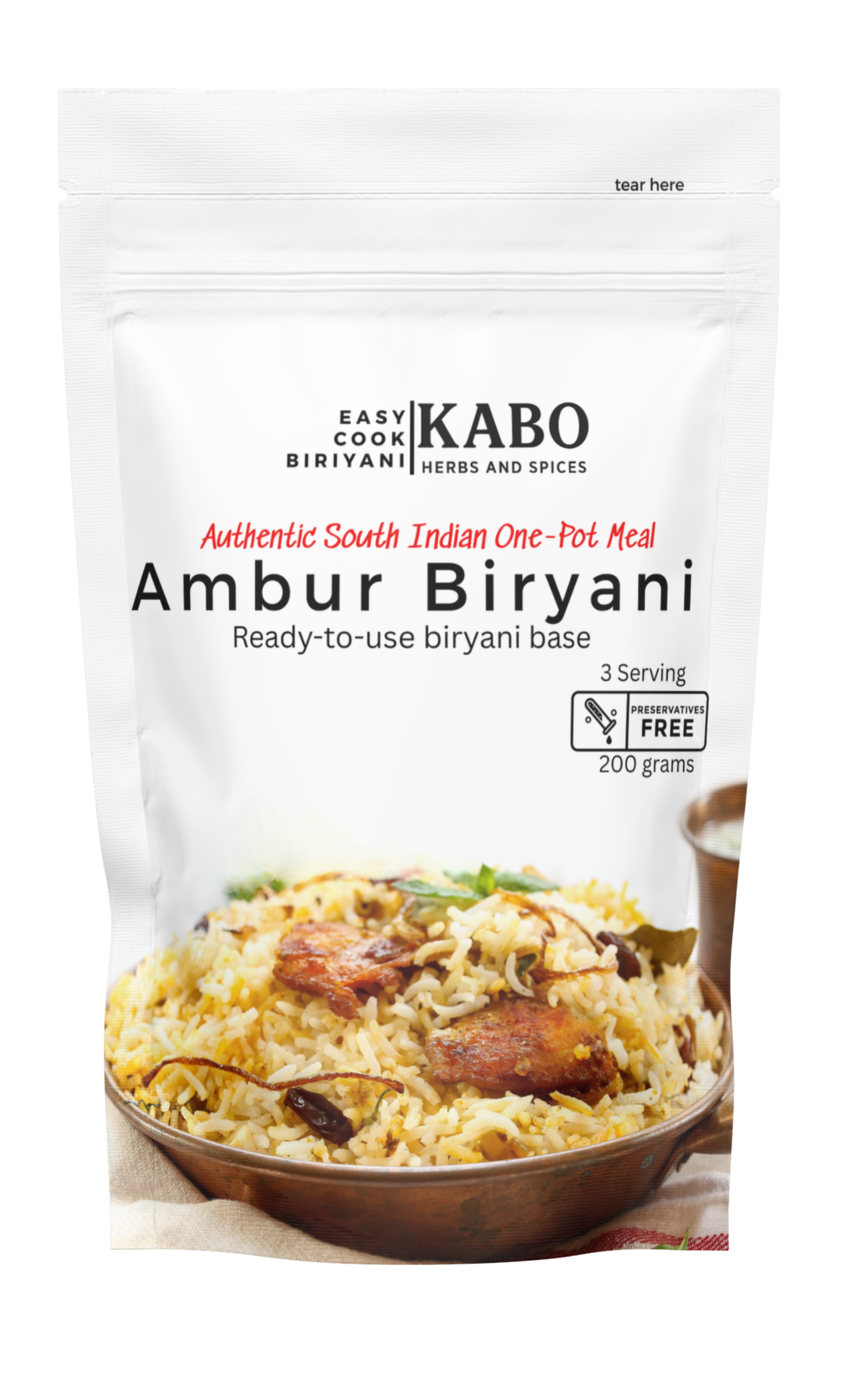 Famous for its subtle yet rich flavours, Ambur biriyani is a Tamil classic. Kabo Ambur Biriyani Gravy brings this tradition to your kitchen in an easy retort pack. Just add rice and protein for a comforting, authentic biriyani ready in 30 minutes.