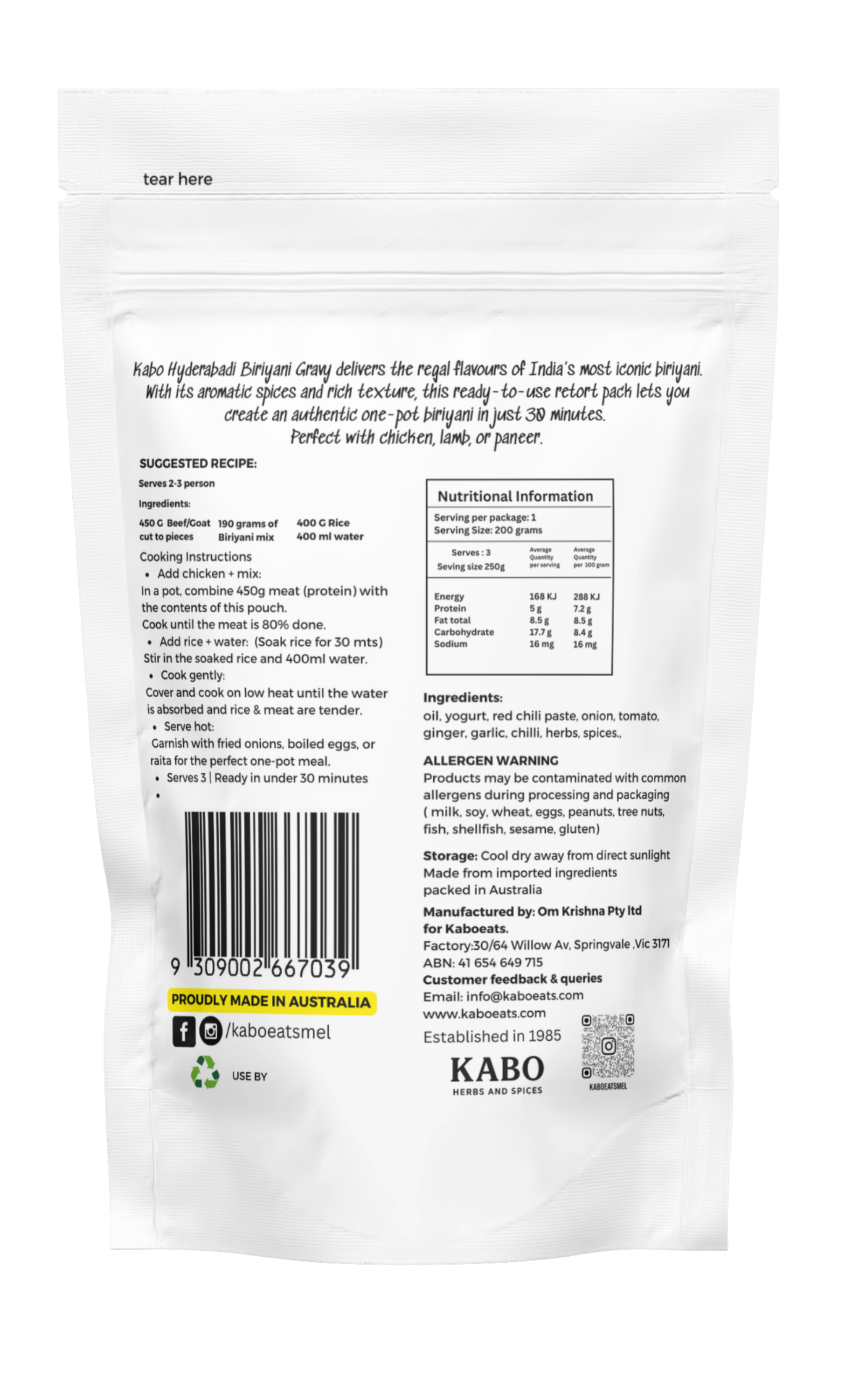 Kabo Hyderabadi Biriyani Gravy delivers the regal flavours of India’s most iconic biriyani. With its aromatic spices and rich texture, this ready-to-use retort pack lets you create an authentic one-pot biriyani in just 30 minutes. Perfect with chicken, lamb, or paneer.
