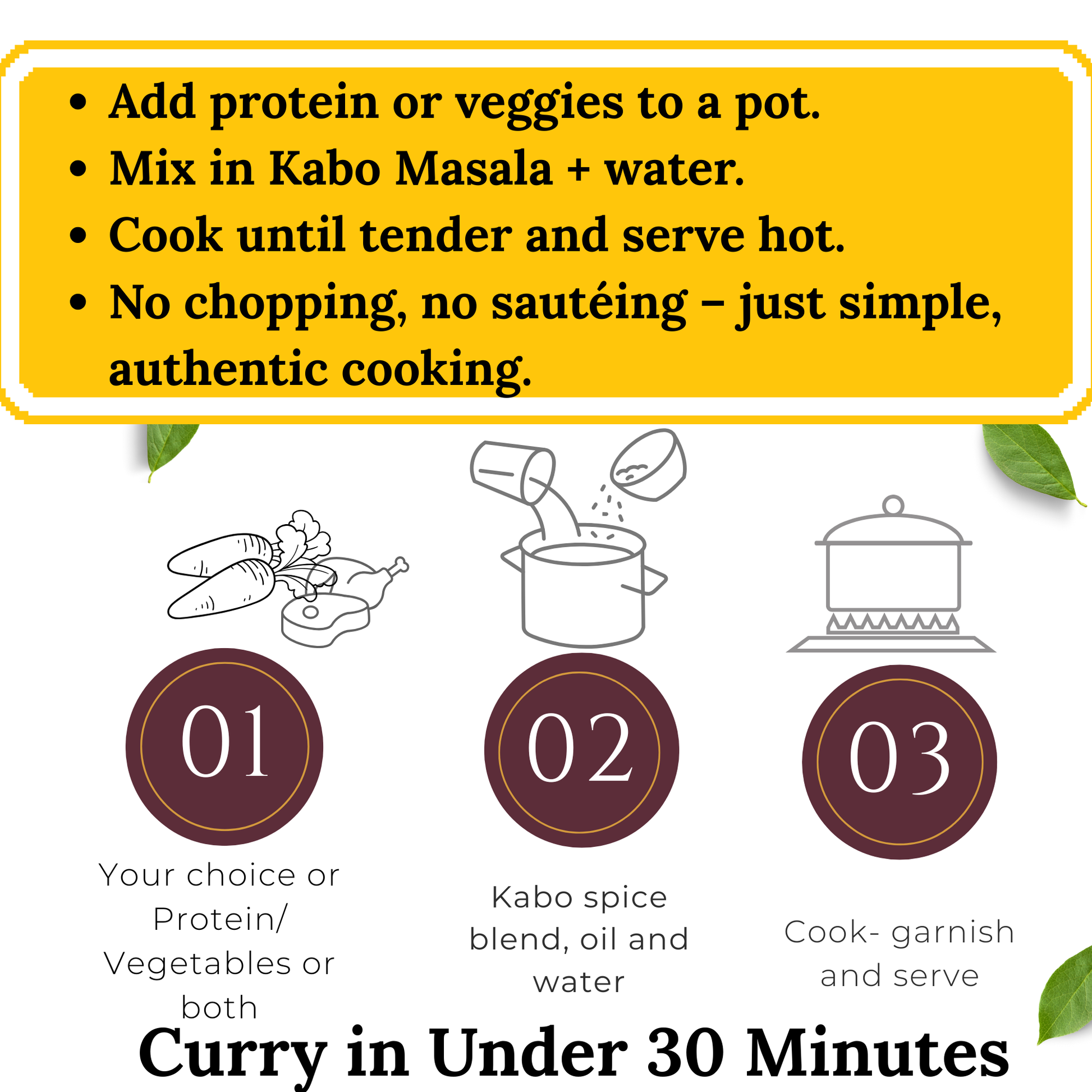 Turn up the heat with Kabo Kolhapuri Masala – a robust, spicy curry blend that captures the fiery spirit of Maharashtra. Perfect for lamb, beef, or hearty veggies, this masala is your shortcut to a full-bodied curry, ready in under 30 minutes. Bold, authentic, and all-natural.