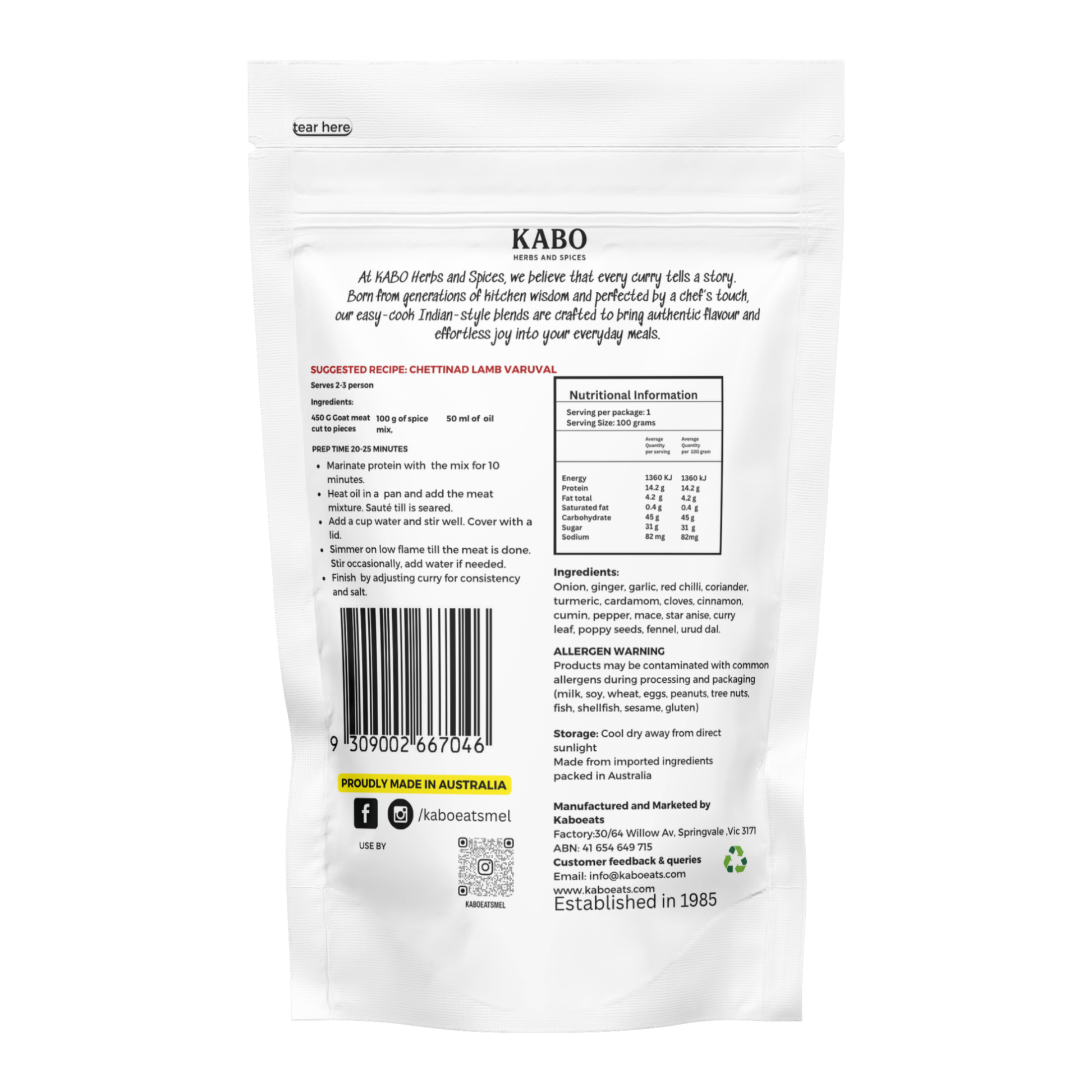 Experience the bold, spicy flavours of South India with Kabo Madras Masala. This ready-to-use blend makes it simple to create a rich, aromatic curry in just 30 minutes. Pair it with beef, chicken, or chickpeas for a satisfying, flavour-packed meal that’s full of authenticity.